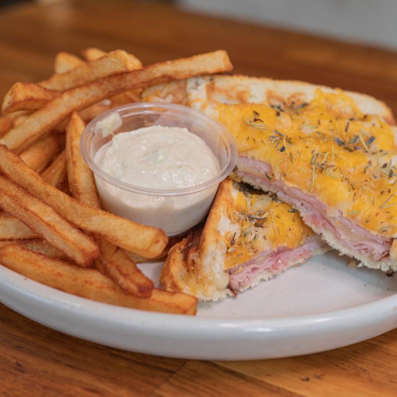 Melted cheese on fresh bread, ham, provolone, jack & cheddar cheese, fries.